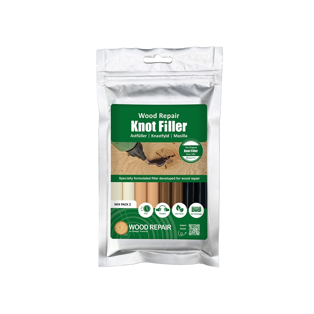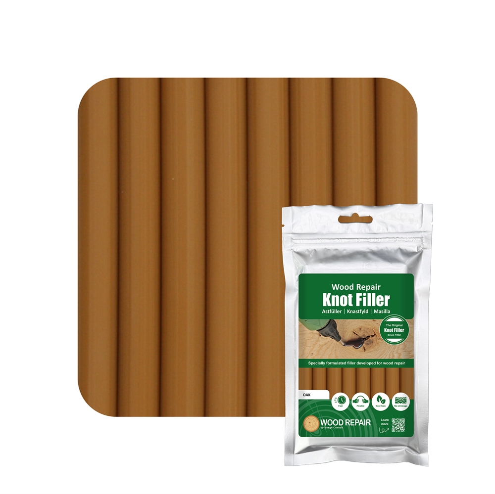 Har du fået en ridse i dit trægulv eller en mindre bule i døren? Med Wood Repair knastfyld kan du nemt udbedre skader i træoverflader, så de næsten bliver usynlige. Denne pakke indeholder 8 stk. knastfyld af samme farve, så du har nok knastfyld til flere reparationer af fx dit gulv eller dine møbler. Perfekt, hvis du vil sikre dig, at du altid har den rigtige farve ved hånden til fremtidige reparationer.