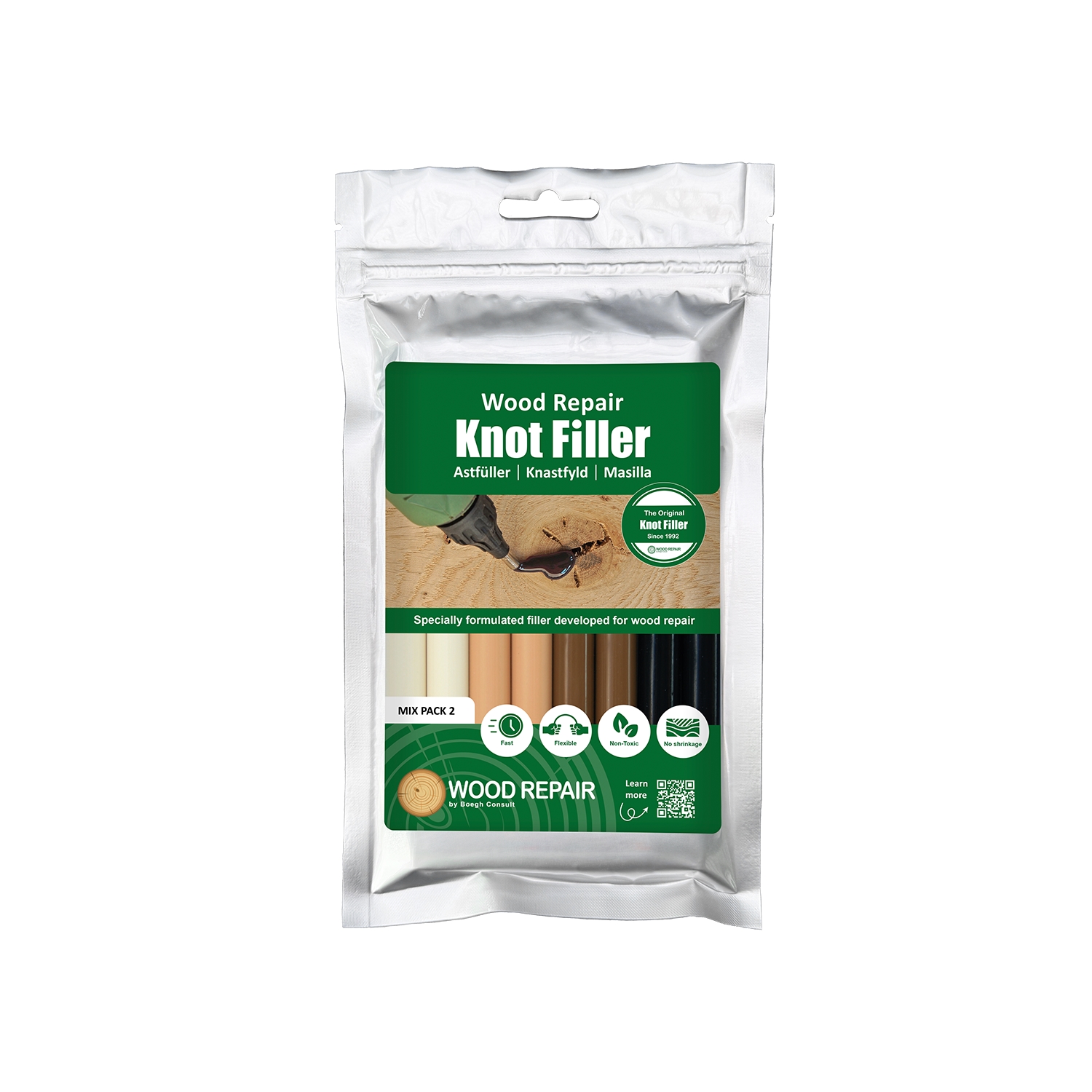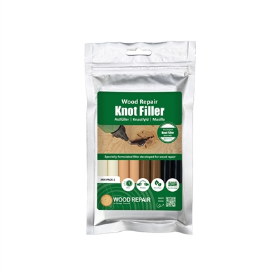 Reparationskittet indeholder 8 forskellige knastfyldfarver, så du nemt kan finde en farve, der matcher din træoverflade. Og selvfølgelig får du også alt nødvendigt værktøj, så du kan gå i gang med det samme!